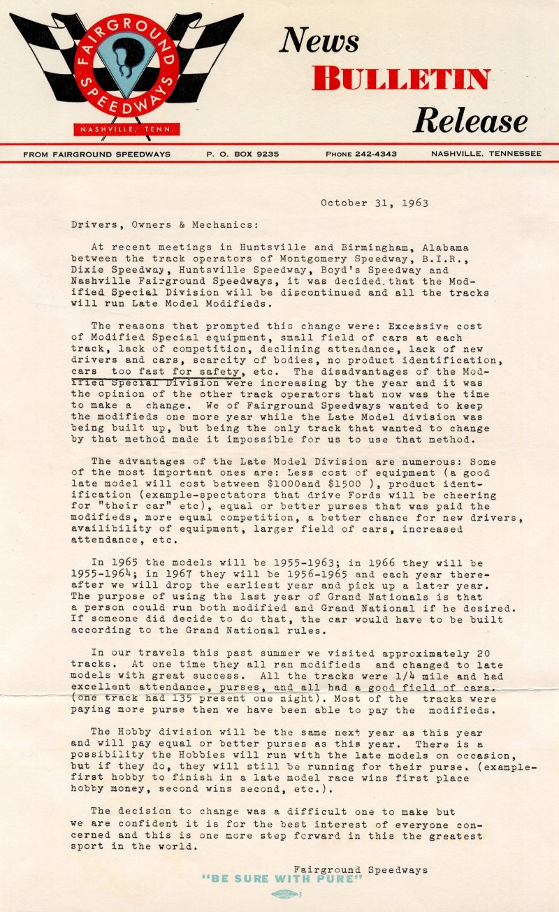 November 1 edition of “The Nashville Tennessean”, “Reactions Hostile to Speedway Move”. Jimmy Griggs, 1962 track champion, was quoted as saying, “I don’t like it at all.”