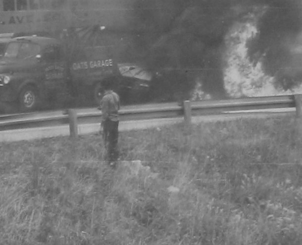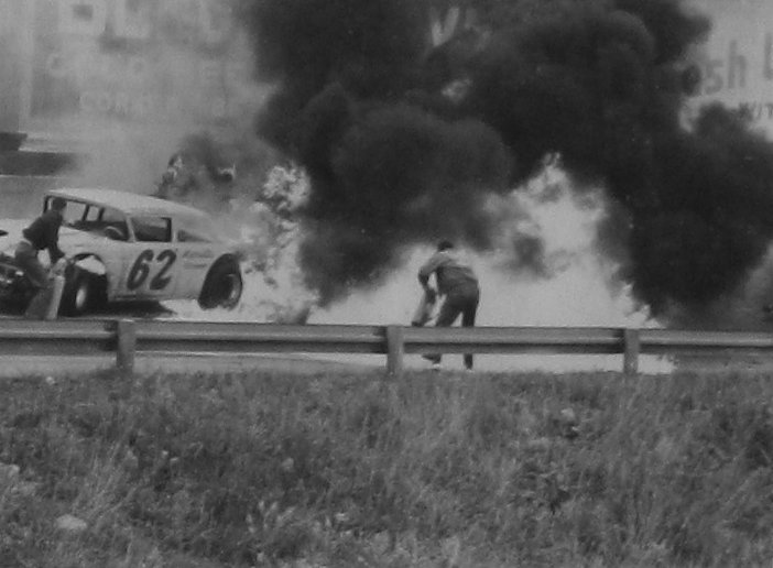 already on the scene cleaning up the wreck. In the age before fuel cells, both the Wallace and Fryar cars and gas leaking from their tanks. As the field rode behind the pace car under the yellow flag, one of the cars backfired