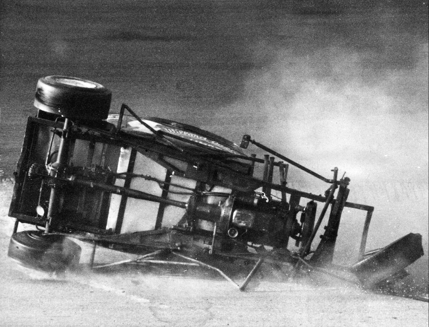 wall, the impact so hard that both rear wheels left the ground. As Brady was spinning, Mitchell was the next car storming into turn 3 and also hit the oil, and with the track