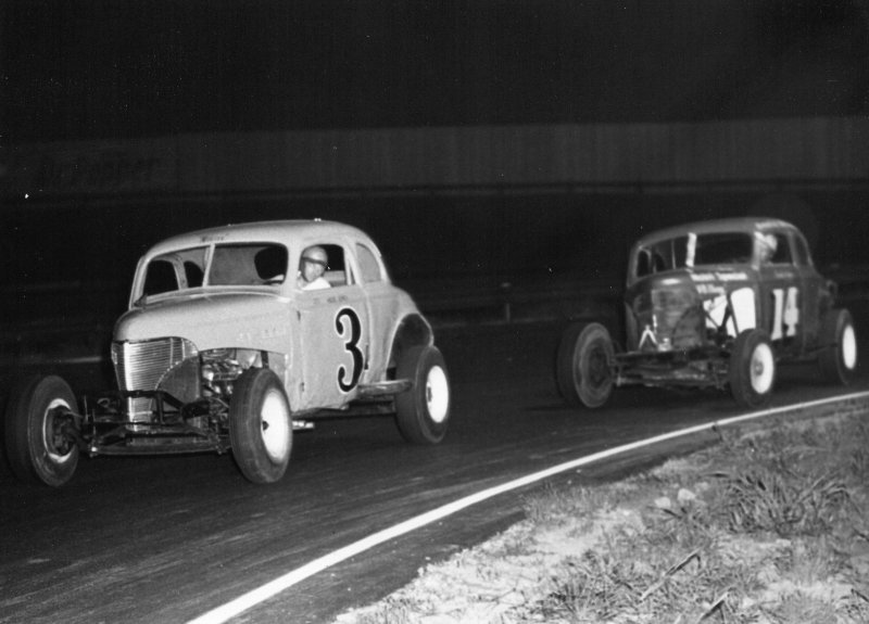 Herb Lewis leads Charlie Griffin on opening night. The next week ripple strips would be added inside the turns to keep drivers from dropping the left side wheels in the infield.