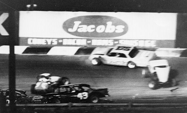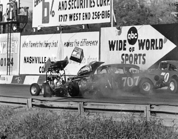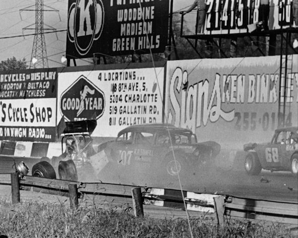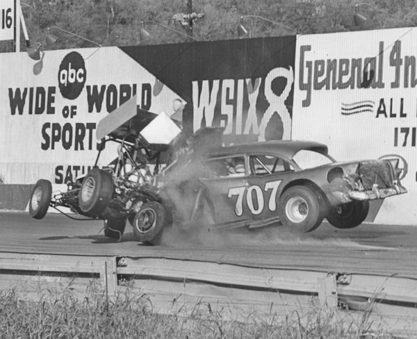 the inside, but Ben Pruitt, driving Bill Dyer's Late Model Chevy #707, hit Glover a ton.
