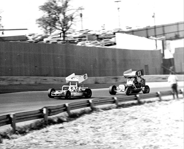 and a sprint car slides down the banking just in front of Walter Wallace